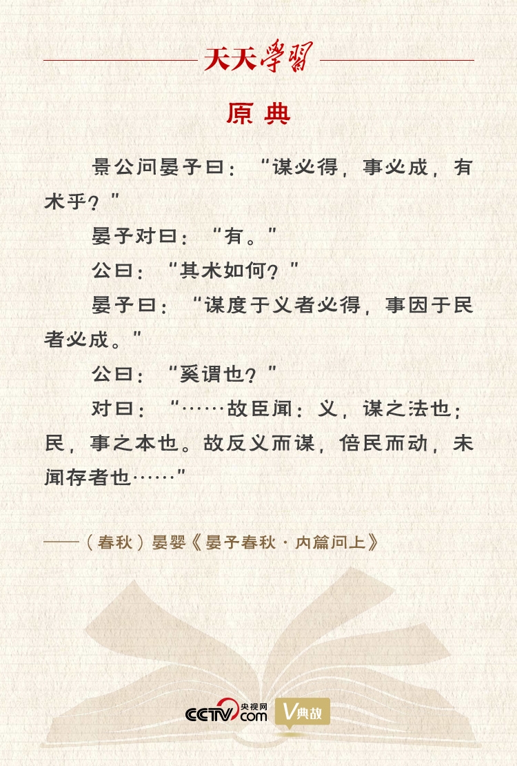 “谋度于义者必得,事因于民者必成”出自《晏子春秋》,意思是谋划时考虑符合道义的就一定能够实现,做事时注重顺从民意的就一定能够成功。
