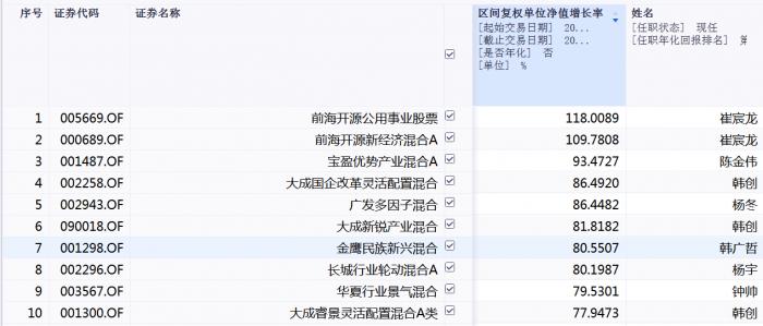 从今年的最新战况来看,目前有2只基金的净值实现翻倍,均是出自前海开源的崔宸龙,截至12月21日,崔宸龙管理的两只基金今年以来均已实现净值翻倍,具体来看,前海开源公用事业收益率为118%,前海开源新经济A收益率为109.78%。陈金伟管理的宝盈优势产业A今年以来收益率为93.5%,目前暂列第三。此外,韩创管理的大成国企改革今年以来收益达到86.5%排名第四、唐晓斌、杨东管理的广发多因子则是86.4%,以微弱的劣势排在第五位。排名前十的基金,今年以来的累计涨幅都超过了77%,涨幅超过5成的基金(A、C类分开计算)达到91只,在大盘表现平平的背景下,业绩可谓可圈可点。