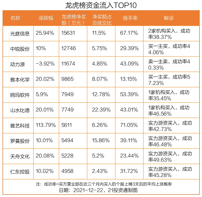 12月22日,上证指数下跌0.07%,深证成指上涨0.7%,创业板指上涨0.55%。盘后龙虎榜数据显示,共有52只个股因当日异动登上龙虎榜,资金净流入最多的是光庭信息(301221.SZ),达1.56亿元。