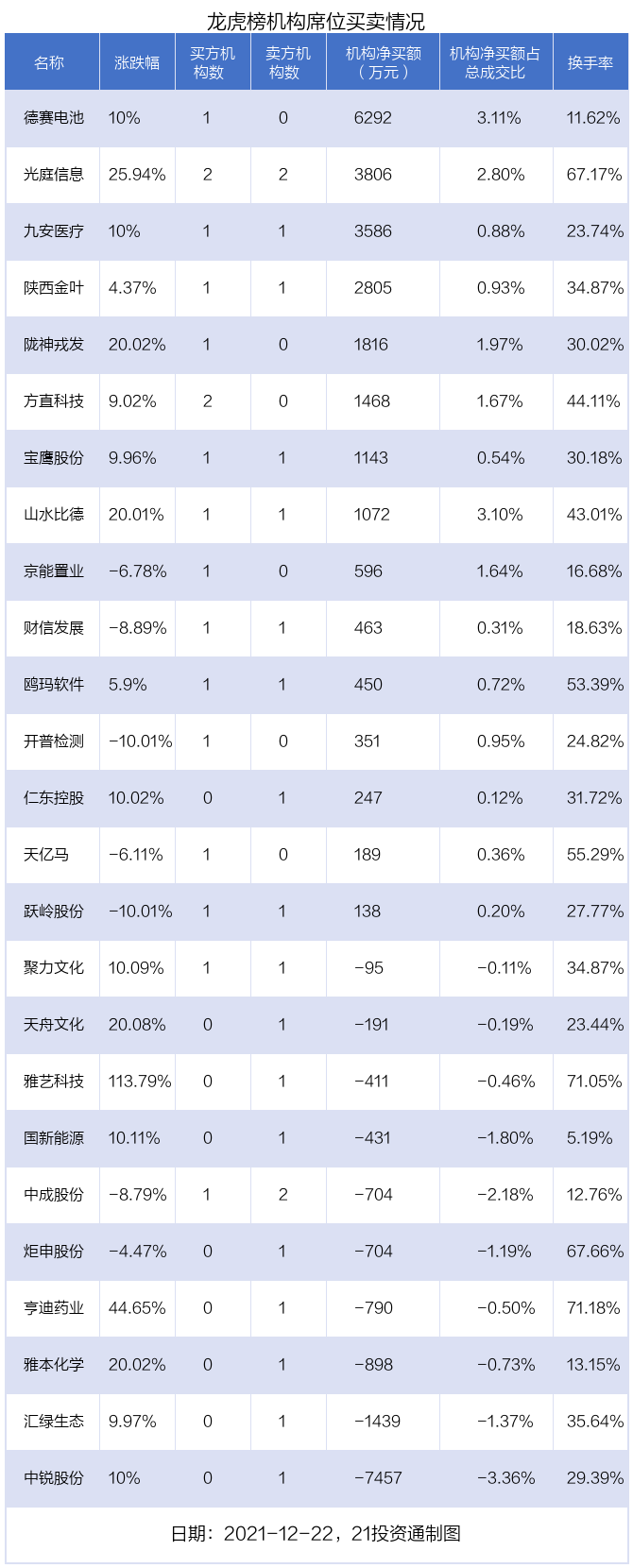 12月22日,25只个股龙虎榜出现了机构的身影,机构合计净买入1.13亿元。具体来看,机构净买入15股,净卖出10股。