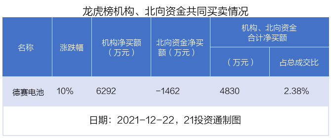 其中,机构净买入金额最多的是德赛电池(000049.SZ),当日收盘上涨10%,换手率为11.62%。