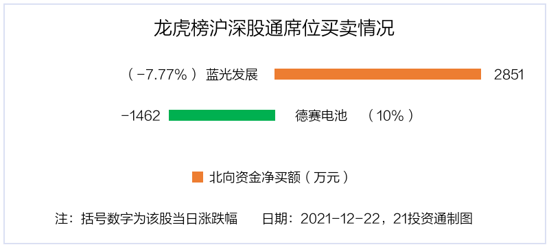 12月22日,北向资金参与龙虎榜中的个股共有2只,合计净买入1388.95万元。其中沪股通净买入1 股,,合计净买入2850.89万元;深股通净卖出1 股,合计净卖出1461.94万元。