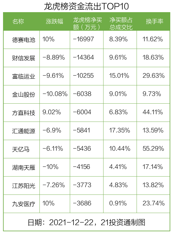 而龙虎榜中资金净流出最多的是德赛电池(000049.SZ),被净卖出为1.7亿元,占总成交金额的8.39%。德赛电池收盘上涨10%,换手率为11.62%。