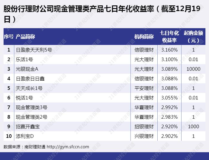 股份行理财公司现金管理类产品收益表现(截至12月19日)