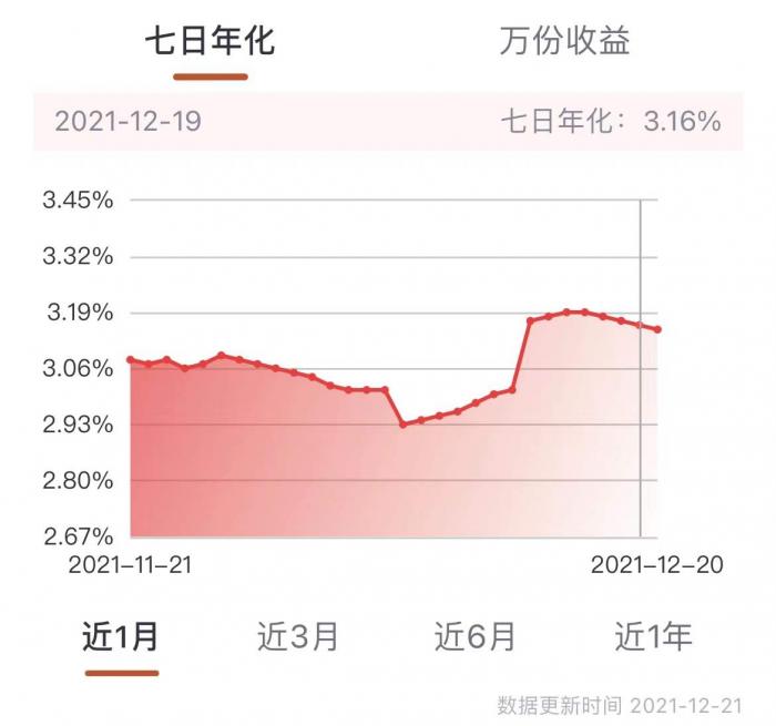 从近一个月七日年化收益率走势来看,该产品收益高点为3.190%(12月16日),近几日略有下滑。另外,12月6日至10日,该产品收益跌破3%,谷值为12月6日2.930%。12月13日便由前一日的七日年化3%大幅跃至3.17%。
