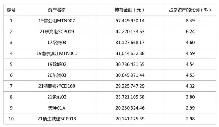 就前十大持仓而言,截至2021年9月30日,城投债占据该产品投资的绝对主流,前五大持仓均为城投债。第一大持仓“19佛公用MTN002”由佛山市公用事业控股有限公司发行,主体评级、债券评级均为AAA,票面利率3.62%,发行价格100元。
