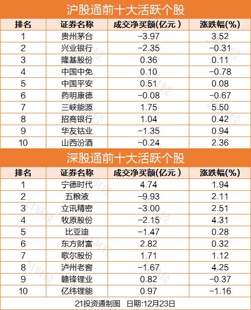 北向资金十大活跃个股方面,宁德时代(300750.SZ)、东方财富(300059.SZ)、三峡能源(600905.SH)分别获净买入4.74亿元、2.82亿元、1.75亿元。