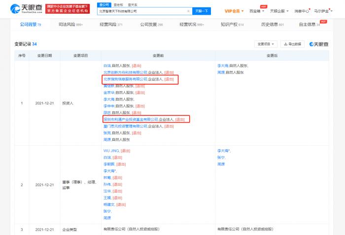 天眼查App显示,近日,知乎关联公司北京智者天下科技有限公司发生工商变更,北京搜狗信息服务有限公司、腾讯关联公司深圳市利通产业投资基金有限公司、白洁、黄继新等多个公司及自然人退出股东行列。