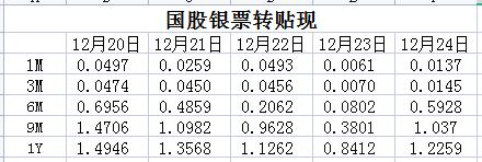 “自12月23日(周四)午盘后,买盘规模收缩,逐步供给大于需求,票据利率迅速反弹。今日,足年国股反弹至1.5%以上,1天时间上涨幅度超50BP,导致周四买在低点机构浮亏超70BP。”一位地方银行票据交易人士表示,并预测称若市场供给保持当前量能,下周利率大概率继续向上。