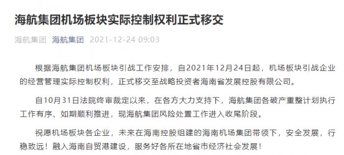 根据海航集团机场板块引战工作安排,自2021年12月24日起,机场板块引战企业的经营管理实际控制权利,正式移交至战略投资者海南省发展控股有限公司。