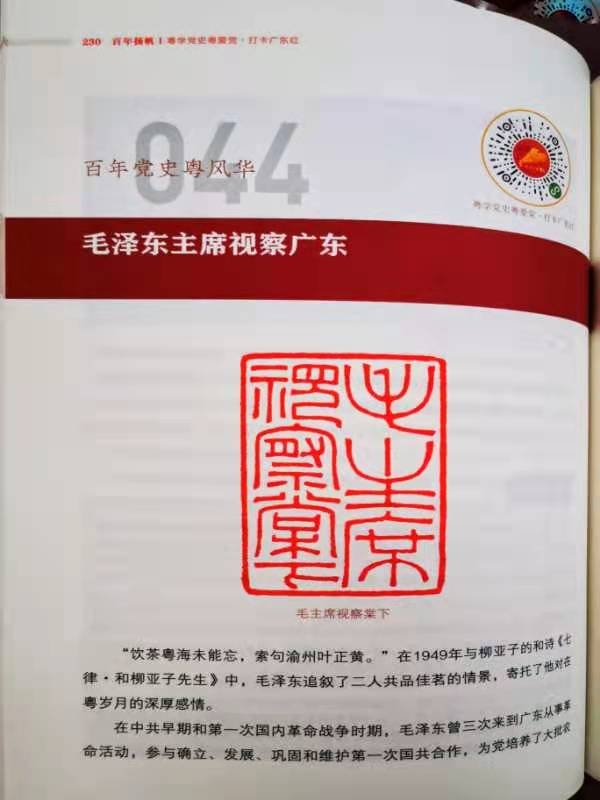 翻开《百年扬帆——粤学党史粤爱党·打卡广东红》(《百年扬帆》),序言首页上,一方端庄典雅、气势恢弘的“热烈庆祝中国共产党成立一百周年”印章跃然眼前:广东第一个党支部成立、中共三大在广州召开、毛主席视察广东、改革开放、习近平新时代中国特色社会主义思想……这一刻,百年党史在广东的一幅幅气壮山河、感天动地、催人奋进、意气风发的历史画面,仿佛向读者讲述着中国共产党领导人民从站起来、富起来到强起来那史诗般的奋斗历程。