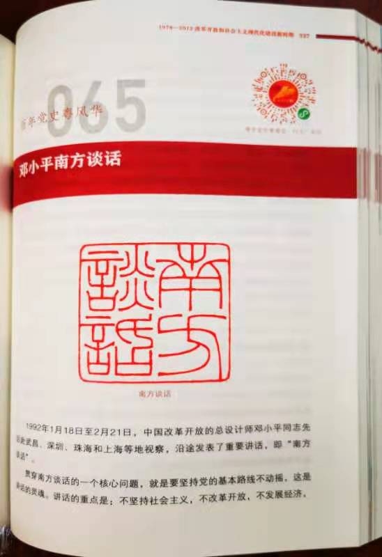 《百年扬帆》编写组负责人说,在书中运用篆刻作品本是偶然之举,因为在编写过程中,如“贯彻八字方针”、“土地改革”、“整顿金融秩序”这些重要篇章时,很难找到合适的历史照片配图,无奈之中,尝试使用印章作为主要设计元素进行补充。随后发现,古朴、大气的篆刻艺术与本书主题、历史故事起到相得益彰,锦上添花的表现效果,所以决定进一步拓展篆刻作品在书中的融合呈现。篆刻作品在书中的丰富展现,是偶然性与必然性有机结合,因为《百年扬帆》的读者面宽、年龄差距大、跨越时代多,既要兼顾读者群体的多样性,呈现形式上也要求多元和创新,所以,除了动漫、VR、网言网语等形式外,《百年扬帆》将篆刻艺术与图书主题深度融合,凸显深厚的美学价值和欣赏价值,实现非物质文化遗产保护和传承功能,满怀豪情地记录着百年党史在广东的光辉实践。