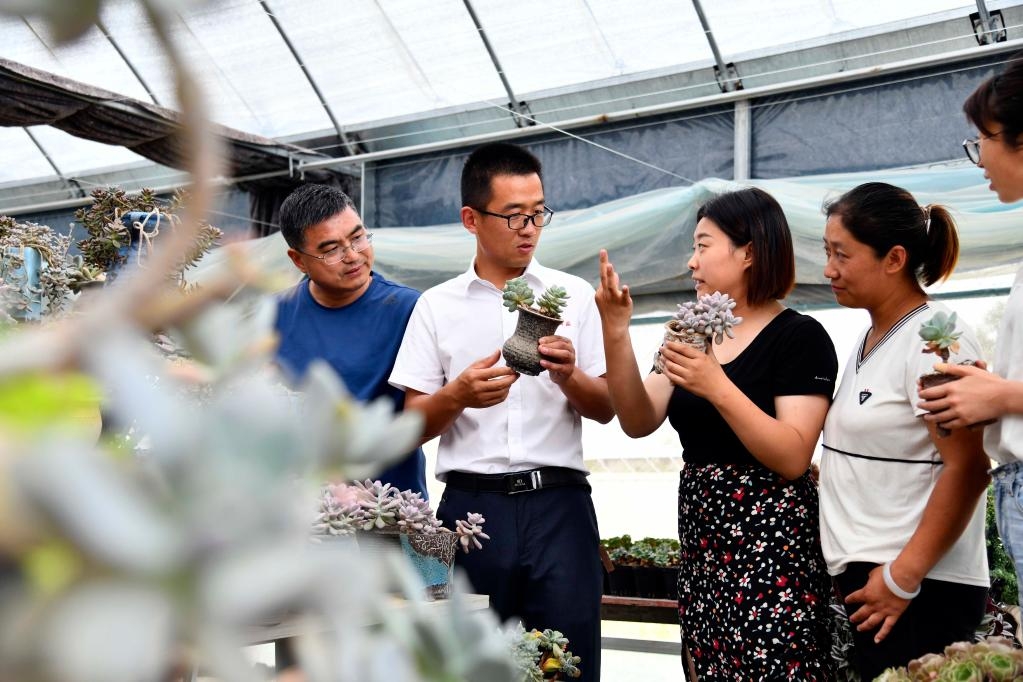 2020年6月9日,在济南市章丘区三涧溪村农业创业园,青年创业党支部书记王元虎(左二)和青年党员一起商量发展事宜。新华社记者王凯摄