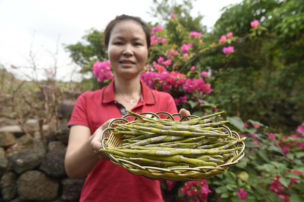 2019年3月14日,村民在海南海口市秀英区石山镇施茶村石斛园展示新鲜的石斛。新华社记者鲁鹏摄