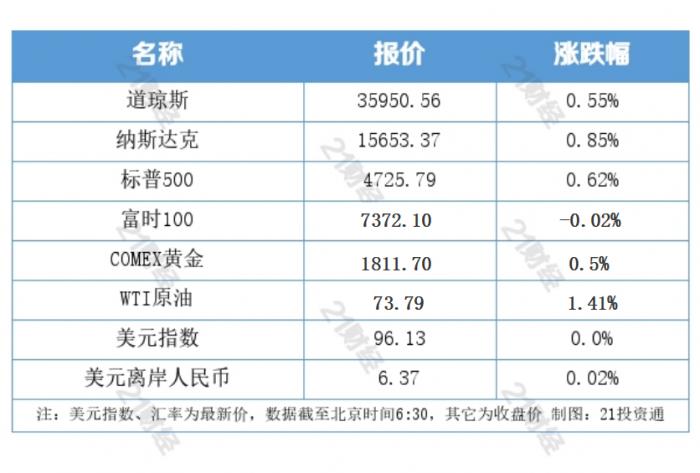 上周四,道指涨幅0.55%,报35950.56点,周涨1.65%;标普500指数涨幅0.62%,报4725.79点,周涨2.28%;纳指涨幅0.85%,报15653.37点,周涨3.19%。