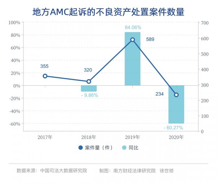 上篇文章主要分析了律所代理全国性AMC的案件量、标的额等相关数据,本篇文章将主要分析地方性AMC的数据情况。地方AMC大多成立于2012年之后,注册资本规模较小。2017年1月1日-2020年12月31日,以地方AMC为原告起诉的金融借款合同纠纷达1498件,其中2017年为355件,2018年为320件,同比减少9.86%。2019年为589件,同比增长84.06%,2020年为234件,同比减少60.27%。(详见下图)。