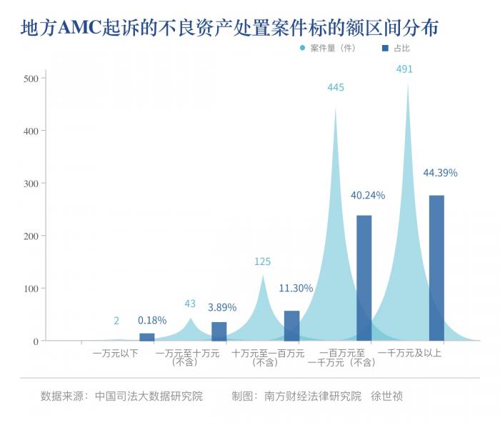 以地方AMC为原告起诉的不良资产处置案件中,我们对其中的1106件(部分文书存在段落缺失等情形导致无法提取标的额,此处以成功提取标的额的案件为统计范围)的标的额进行了分析。结果显示,案件标的额在一千万元及以上的案件量占比最多,达44.39%;其次是标的额为一百万元至一千万元(不含)的案件量,占比为40.24%;标的额在十万元至一百万元(不含)的案件量占比为11.30%。此外,标的额在一万元至十万元(不含)的案件数量占比为3.89%,标的额在一万元以下的案件量仅占0.18%(详见下图)。