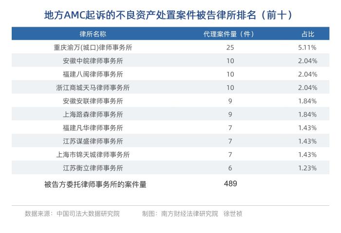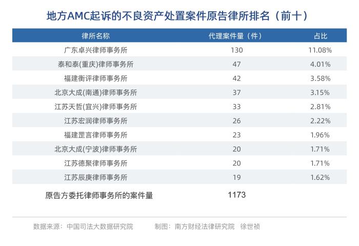 以地方AMC为原告起诉的金融借款合同纠纷案件中,其中1173件案件,由律师事务所为原告提供法律服务。代理案件数量第一名是广东卓兴律师事务所,代理的案件数量为130件,第二名是泰和泰(重庆)律师事务所,代理的案件数量为47件,第三名为福建衡评律师事务所,代理的案件数量是42件(前十的律所详见下表)。