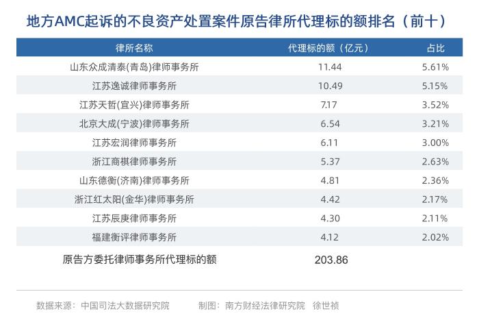 以地方AMC为原告起诉的金融借款合同纠纷案件中,原告方委托律师事务所代理标的额总额为203.86亿元。其中,山东众成清泰(青岛)律师事务所排在第一位,为11.44亿元;第二名江苏逸诚律师事务所,代理标的额为10.49亿元;排在第三名的是江苏天哲(宜兴)律师事务所,为7.17亿元。(前十的律所详见下表)。