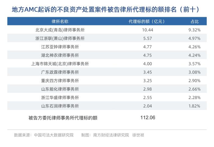 以地方AMC为原告起诉的金融借款合同纠纷案件中,被告方委托律师事务所代理标的额总额为112.06亿元。其中,北京大成(青岛)律师事务所排在第一位,为10.44亿元;第二名浙江浙联(萧山)律师事务所,代理标的额为5.57亿元;排在第三名的是广江苏亚钟律师事务所,为4.77亿元。(前十的律所详见下表)。