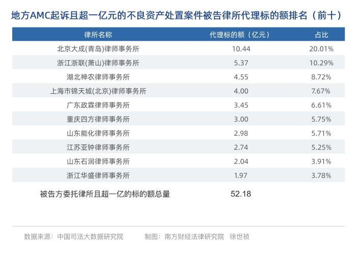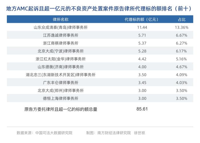 以地方AMC为原告起诉处置且超一亿元的不良资产案件中,原告方委托律师事务所代理标的额排名如下(前十)。山东众成清泰(青岛)律师事务所排在第一位,代理标的额为11.44亿元;排在第二的是江苏逸诚律师事务所,代理标的额为5.71亿元;第三名是浙江商祺律师事务所,代理标的额为5.37亿元。