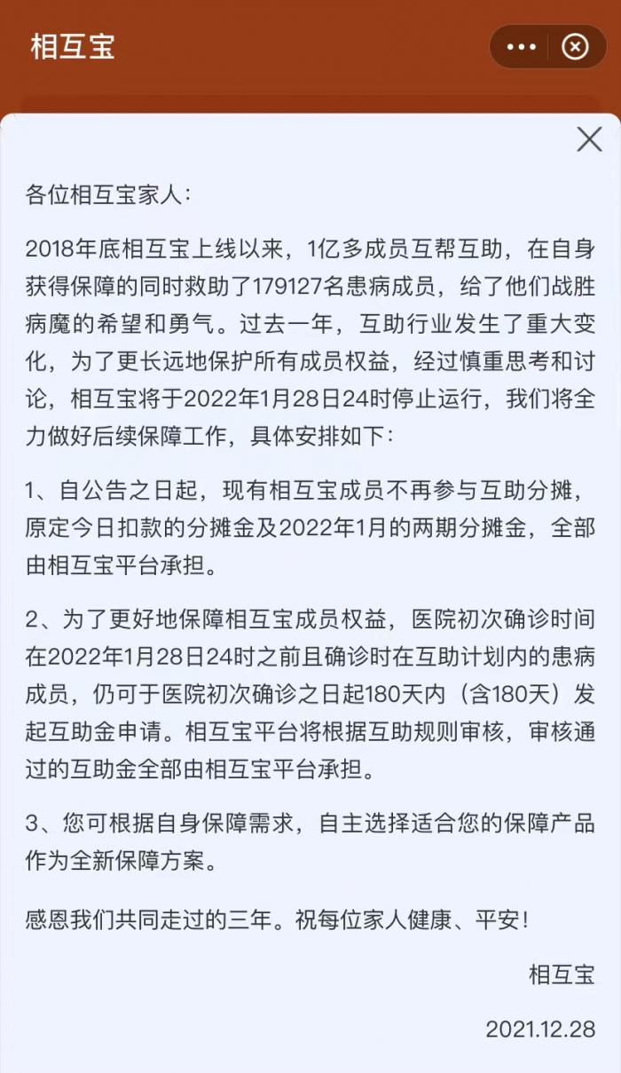 12月28日,相互宝发布公告称,将于2022年1月28日24时停止运行。自公告之日起,现有相互宝成员不再参与互助分摊,原定今日扣款的分摊金及2022年1月的两期分摊金,全部由相互宝平台承担。为了更好地保障相互宝成员权益,医院初次确诊时间在2022年1月28日24时之前且确诊时在互助计划内的患病成员,仍可于医院初次确诊之日起180天内(含180天)发起互助金申请。相互宝平台将根据互助规则审核,审核通过的互助金全部由相互宝平台承担。