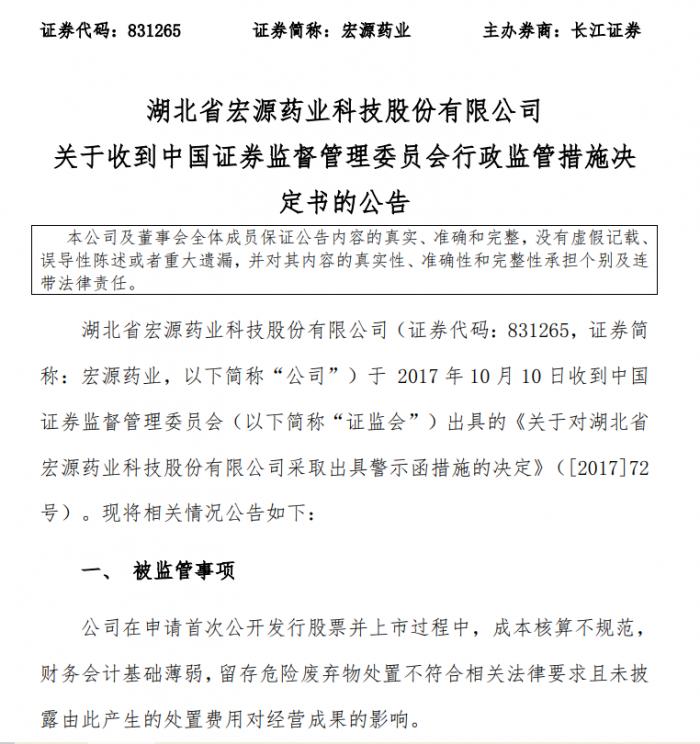 2017年10月,宏源药业再次收到证监会的处罚,因公司前次申请上市过程中,成本核算不规范,财务会计基础薄弱,留存危险废弃物处置不符合相关法律要求且未披露由此产生的处置费用对经营成果的影响,被证监会出具警示函。
