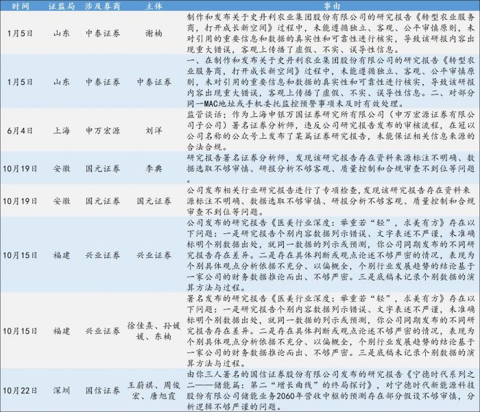 根据21世纪资本研究院统计,各地证监局在2021年,共对券商及个人,就研究所的违规情况下发了8份监管函,涉及到的券商包括中泰证券、申万宏源、国元证券、兴业证券、国信证券等5家券商。