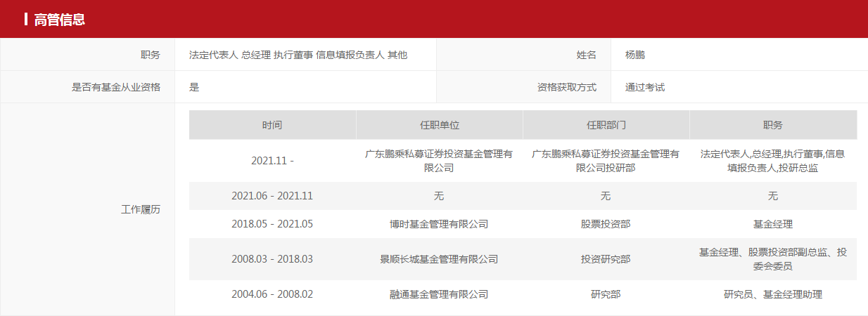 “奔私”前,杨鹏曾在三家公募基金公司有过任职。履历显示,2004至2008年,杨鹏在融通基金任研究员、基金经理助理,后在景顺长城基金任基金经理、股票投资部副总监、投委会委员,直至2018年进入博时基金任股票投资部基金经理,并于今年5月离职。
