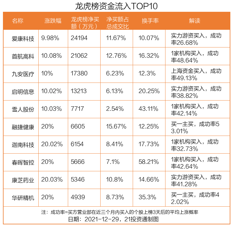 12月29日,上证指数下跌0.91%,深证成指下跌1.24%,创业板指下跌1.4%。盘后龙虎榜数据显示,共有40只个股因当日异动登上龙虎榜,资金净流入最多的是爱康科技(002610.SZ),达2.42亿元。