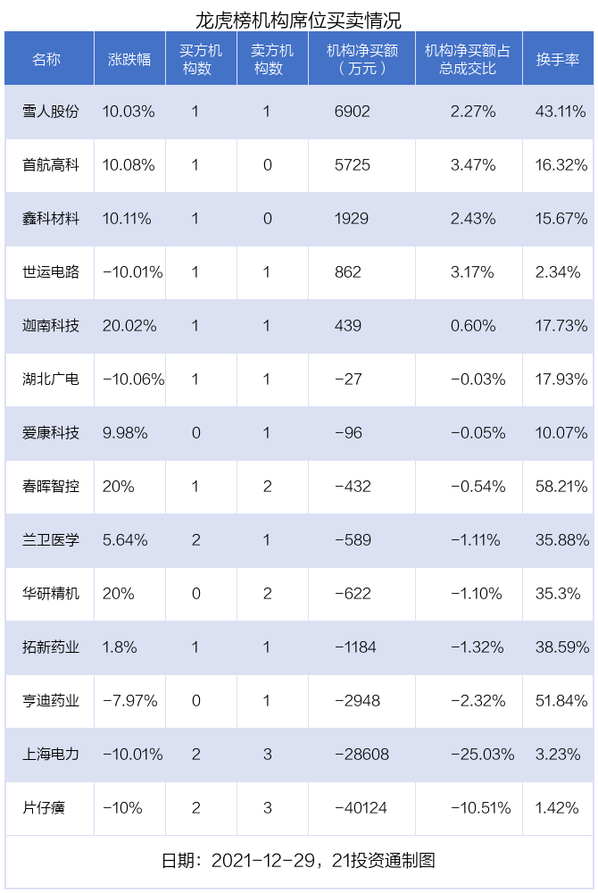 其中,机构净买入金额最多的是雪人股份(002639.SZ),当日收盘上涨10.03%,换手率为43.11%。前五大买卖营业部中有2家机构,合计净买入6902万元,占总成交金额的2.27%。