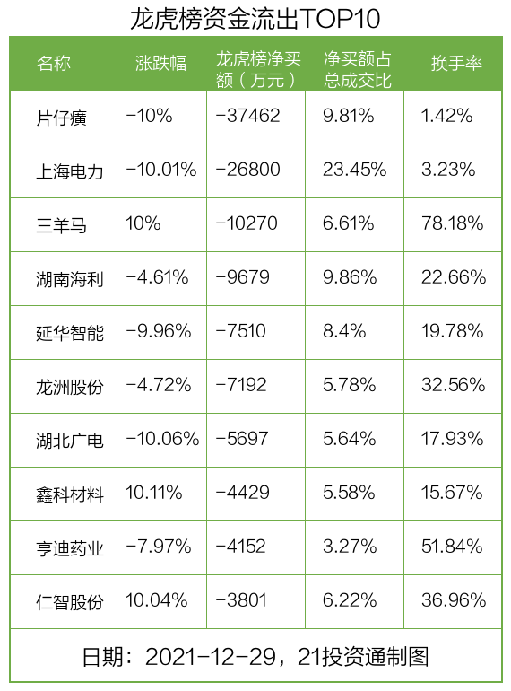 而龙虎榜中资金净流出最多的是片仔癀(600436.SH),被净卖出为3.75亿元,占总成交金额的9.81%。片仔癀收盘下跌10%,换手率为1.42%。