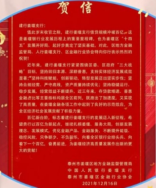12月16日下午,泰州市姜堰区地方金融监管局、人行姜堰支行、姜堰区金融协会领导为建行姜堰支行送来贺信,祝贺建行姜堰支行信贷规模突破百亿大关。