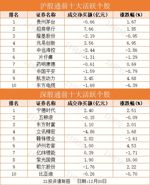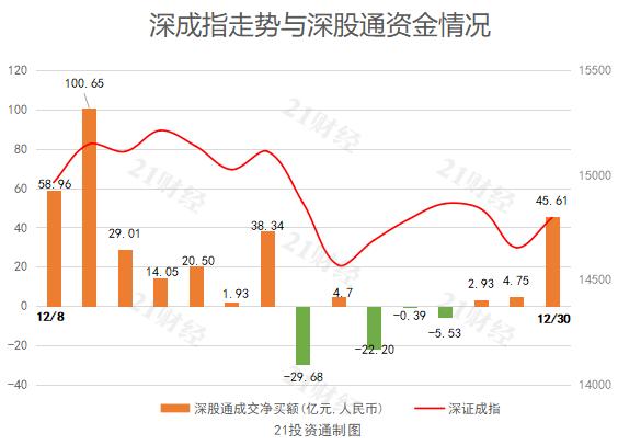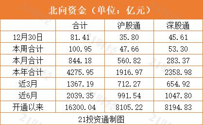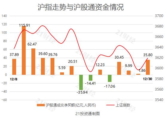 据21投资通(微信号ID:touzit21)智能监测,12月30日,北向资金净买入81.41亿元,其中沪股通净买入35.80亿元,深股通净买入45.61亿元。北向资金已连续4个交易日净买入。