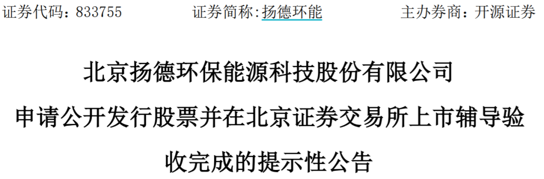 12月31日,扬德环能(833755)发布上市辅导验收完成的提示性公告。