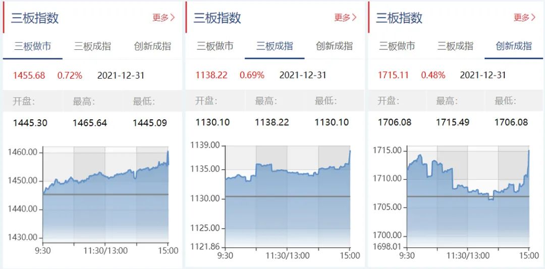 截至12月31日收盘,三板做市报1455.68点,上涨0.72%;三板成指报1138.22点,上涨0.69%;三板创新报1715.11点,上涨0.48%。