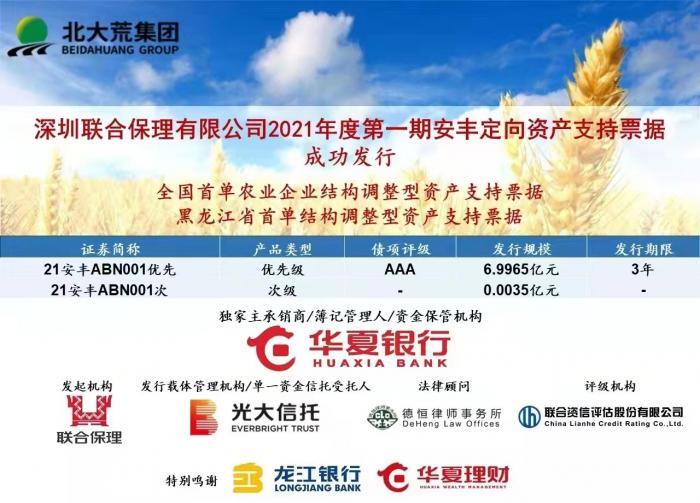 2021年12月30日,华夏银行携手北大荒集团成功发行“深圳联合保理有限公司2021年度第一期安丰定向资产支持票据(ABN)”。本期ABN由华夏银行作为独家主承销商,注册金额45亿元,首期发行规模7亿元。该笔业务是全国首单农业企业结构调整型资产支持票据、黑龙江省首单结构调整型资产支持票据。