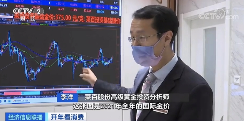 菜百股份高级黄金投资分析师 李洋:这张图是2021年全年的国际金价,年初开盘1900美元左右,随着一季度震荡下跌,二季度一个V型的反转,下半年金价围绕1800美元区间上下波动,全年收盘在1829美元。金价每次在下跌过程中,投资者都会集中购买投资产品,作为家庭资产的储备。