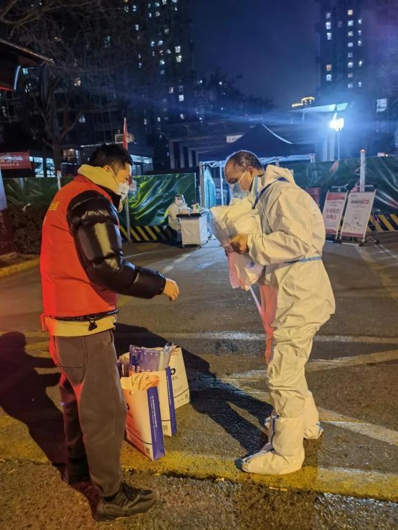 在供货商的优先安排和全力保障下,在六小时之内,八十余箱的医用防护服以及共计上百箱的N95口罩、面罩、手套、脚套、酒精喷雾等防疫物资就备货完毕顺利抵达。而负责为一线下沉干部送去防疫物资的工作小分队,几乎彻夜未眠。