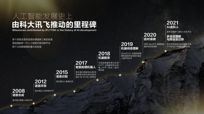 22年来始终坚持“顶天立地”的理念和追求,通过源头技术创新,在人工智能发展史上树立了语音合成、语音识别、认知智能等多个里程碑,推动智能语音及人工智能走在世界前列。引领推动人工智能技术在教育、医疗、城市、消费品、工业等场景的规模化应用。