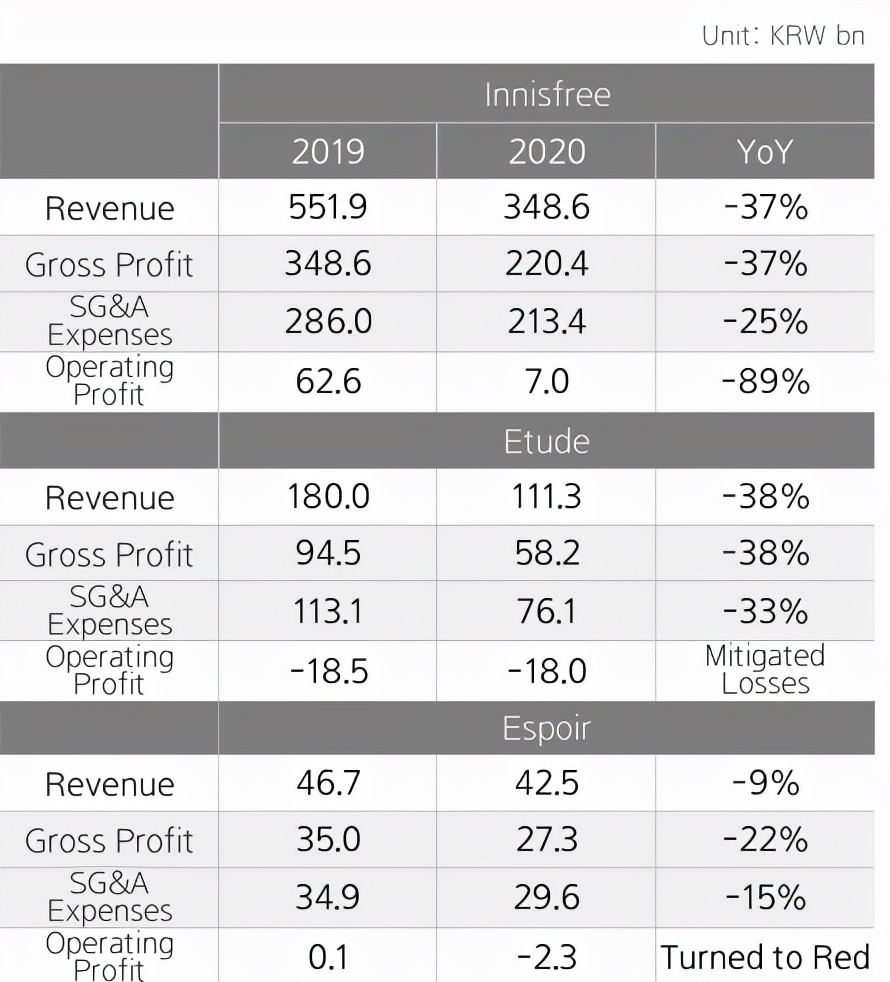 悦诗风吟作为爱茉莉集团旗下品牌,2020年的营收同比减少37%至3486亿韩元(约合人民币20亿元),与2016年巅峰时期的7700亿韩元营收相比,直接打了对折,利润也暴跌89%到7亿韩元(约合人民币403万元)。