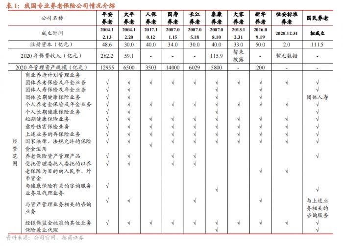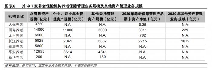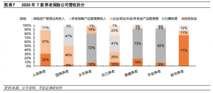 根据公司官网公开披露,2020年太平养老、长江养老个人养老保障产品规模分别687.32亿元、2036.09亿元,在养老保障产品总规模中分别占比87.92%、91.91%。此外,其他资产管理业务规模也较大,国寿养老、长江养老、新华养老其他资管业务规模共计约2050.88亿元。