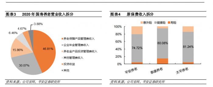 目前,国寿养老、新华养老、太平养老、泰康养老和平安养老的业务范围更大,与养老关联性较弱的保险业务更多。2020年国寿养老的营收中,养老保障产品管理费收入占比高达46.81%;太平养老、泰康养老和平安养老的营收以已赚保费为主,占比均在70%以上,而健康险保费在原保费收入中占比高达75%左右。