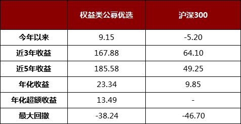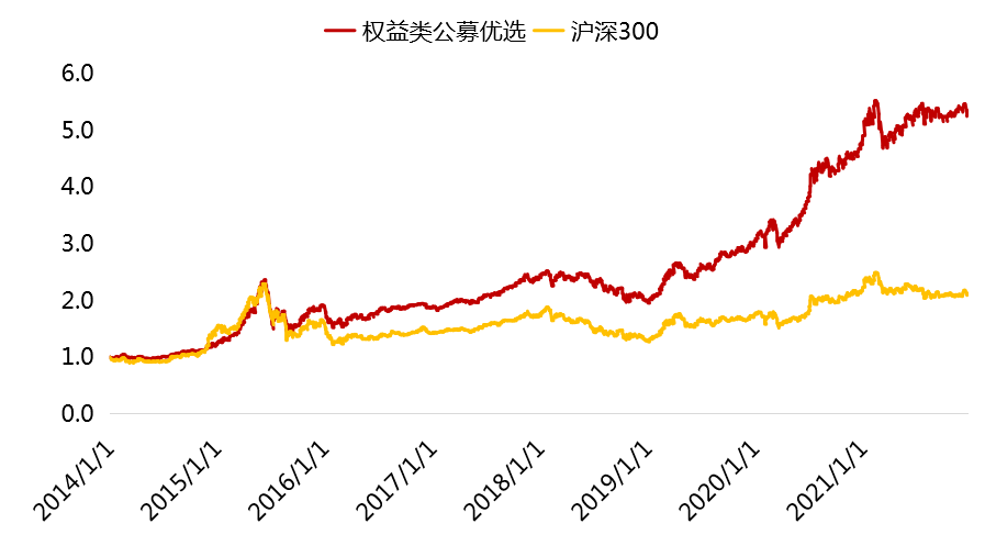 权益类公募优选长期业绩表现(%,截至2021/12/31)