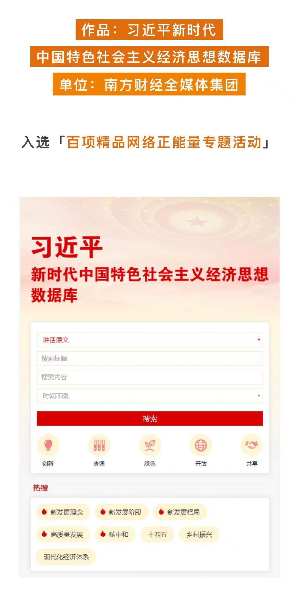 其中,南方财经全媒体集团官方客户端21财经客户端【学习经济】频道出品的《习近平新时代中国特色社会主义经济思想数据库》入选「百项精品网络正能量专题活动」。