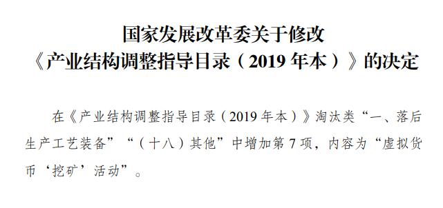 1月10日,国家发展改革委修改《产业结构调整指导目录(2019年本)》。在《产业结构调整指导目录(2019年本)》淘汰类“一、落后生产工艺装备”“(十八)其他”中增加第7项,内容为“虚拟货币‘挖矿’活动”。