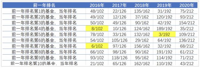根据中欧基金统计,2015-2019年每年排名前10的股票型基金,观察它们在次年的收益表现。发现前一年排名靠前的基金,在下一年表现并没有继续出色。