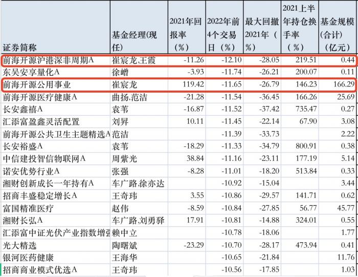 前海开源公用事业(崔宸龙)-26.79%、前海开源新经济A(崔宸龙)-24.91%、长城行业轮动A(杨宇)-19.34%。