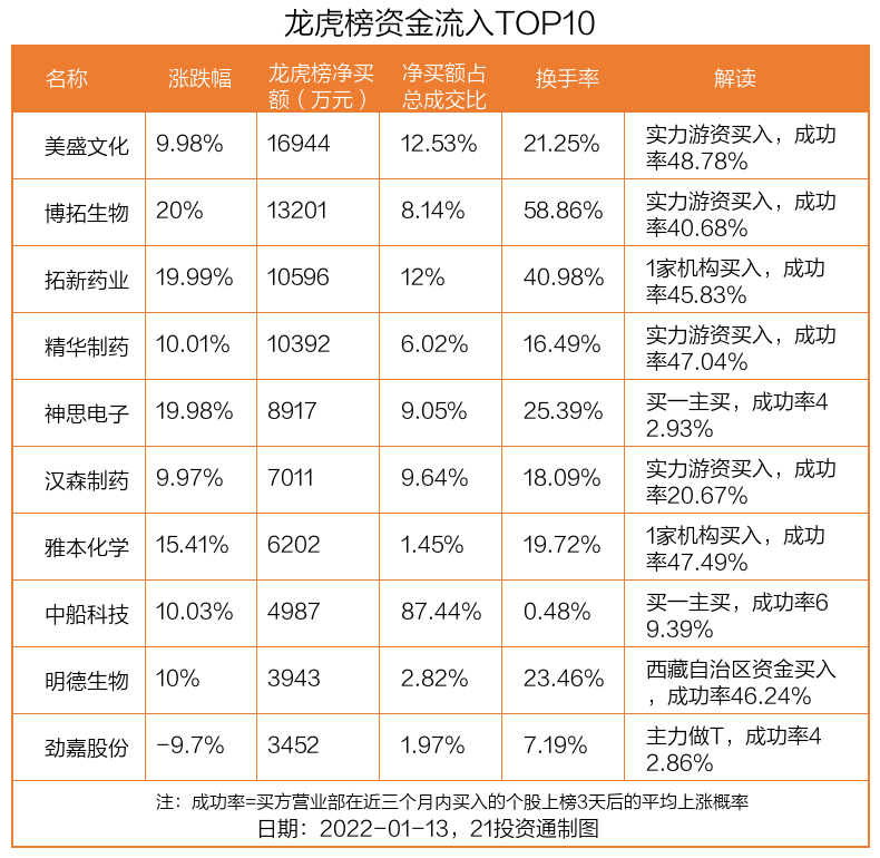 1月13日,上证指数下跌1.17%,深证成指下跌1.96%,创业板指下跌1.71%。盘后龙虎榜数据显示,共有55只个股因当日异动登上龙虎榜,资金净流入最多的是美盛文化(002699.SZ),达1.69亿元。