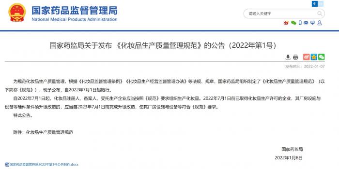 近日,国家药品监督管理局正式出台《化妆品生产质量管理规范》(下称《规范》),并将于2022年7月1日起正式施行。《规范》共9章67条,涉及机构与人员、质量保证与控制、厂房设施与设备管理、物料与产品管理、生产过程管理、委托生产管理、产品销售管理等方面,对化妆品生产全过程做出多维度控制和要求。